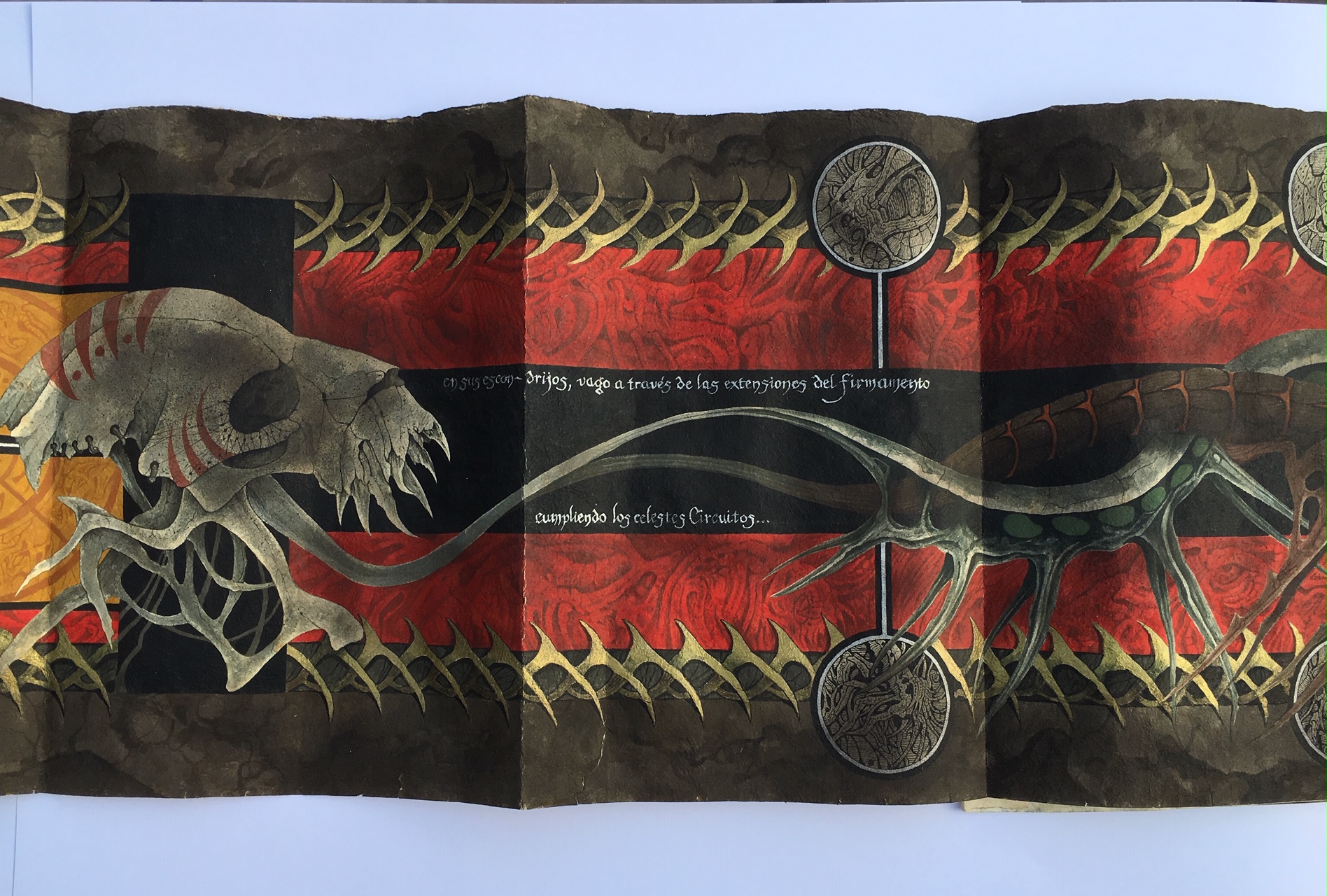 Pintura en acrílico sobre tira de papel amate de 42.5 x 238 cm, plegada "en biombo"(42.5 x 31.5 cm), que incluye carpeta de piel color tabaco con aplicaciones metálicas de 45.5 x 34.3 x 3.4 cm/ 2006