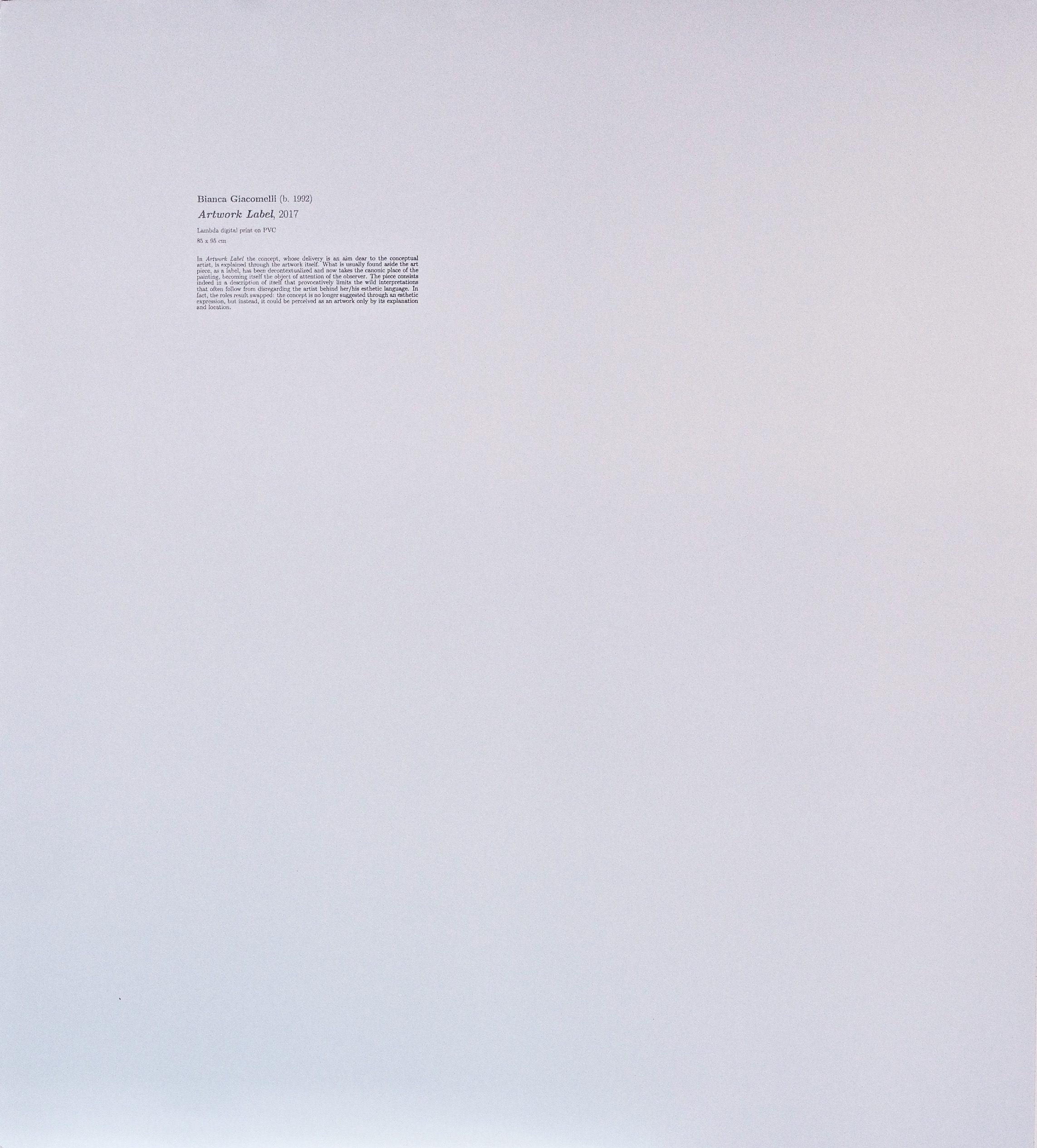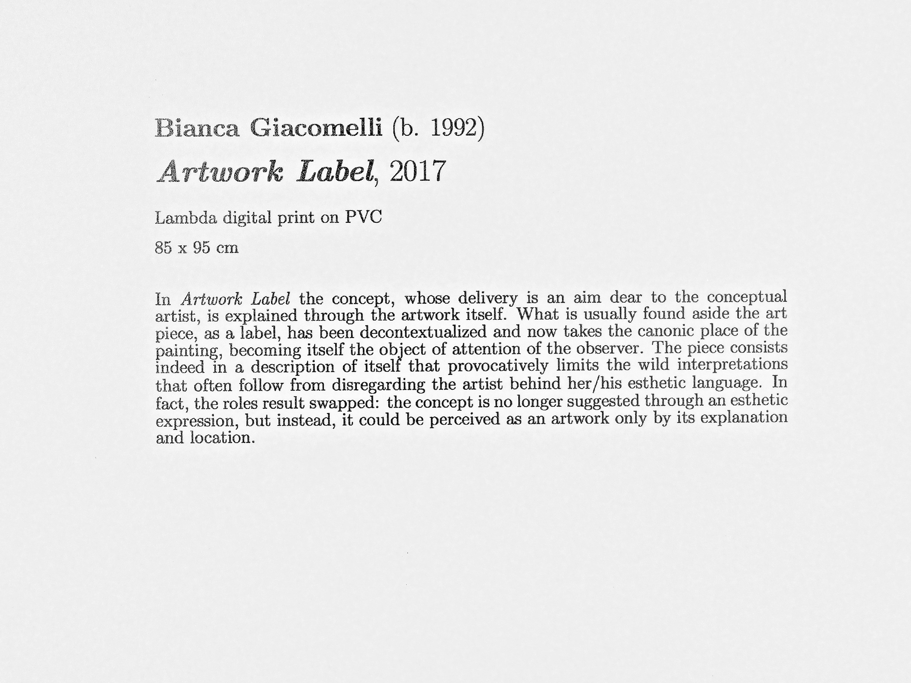 In Artwork label the concept, whose delivery is an aim dear to the conceptual artist, is explained through the artwork itself. What is usually found aside the art piece, as a label, has been decontextualized and now takes the canonic place of the painting, becoming itself the object of attention of the observer. The piece consists indeed in a description of itself that provocatively limits the wild interpretations that often follow from disregarding the artist behind her/his esthetic language. In fact, the roles result swapped: the concept is no longer suggested through an esthetic expression, but instead, it could be perceived as an artwork only by its explanation and location.