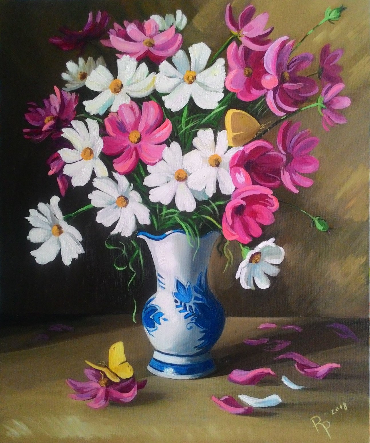 Gently pink, coupled with white tones. Flowers stand out on the dark background with playing light. Yellow butterflies are an accent, but they do not irritate the eye due to their brightness. Pink, white, blue and yellow in harmony.